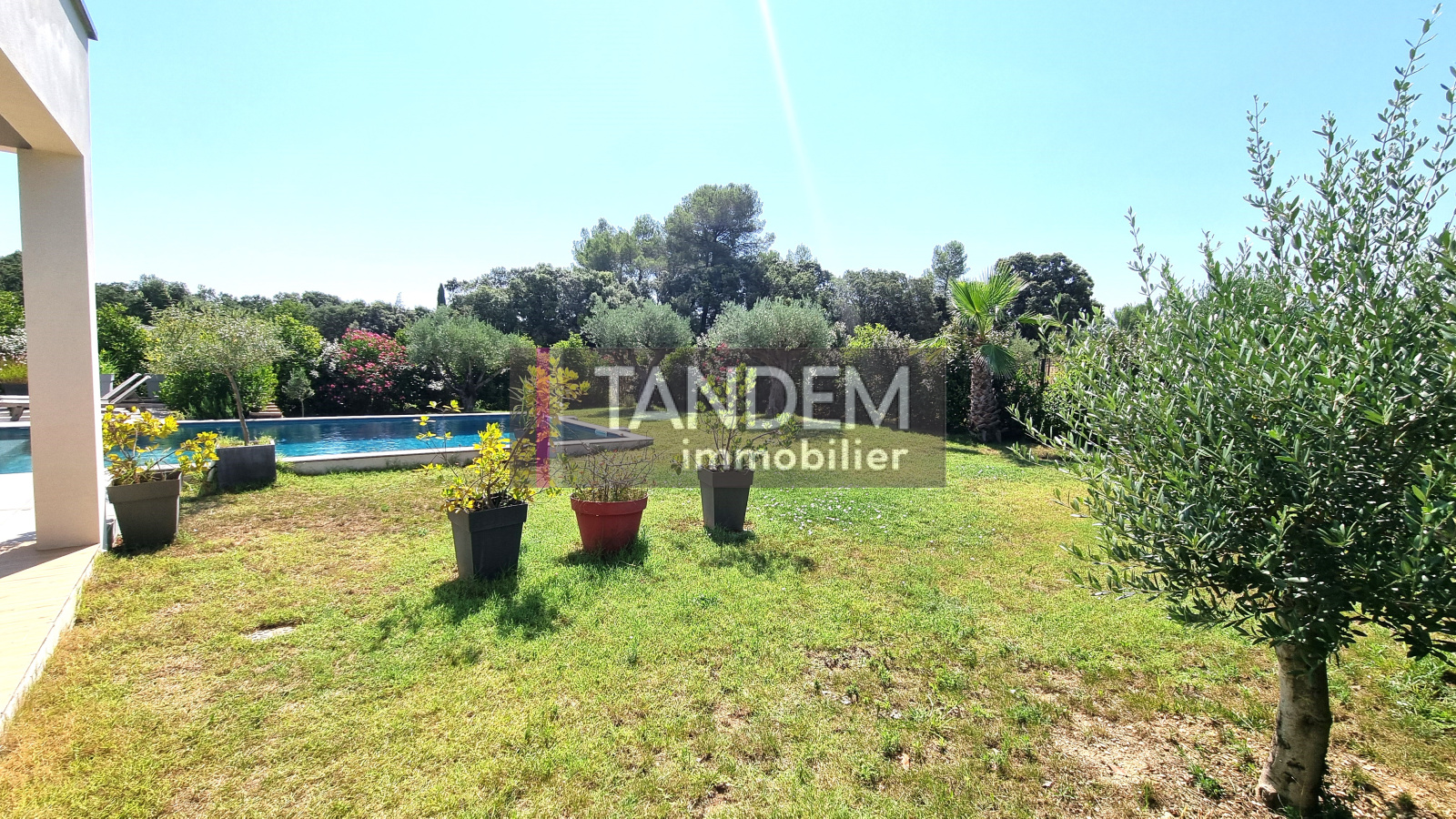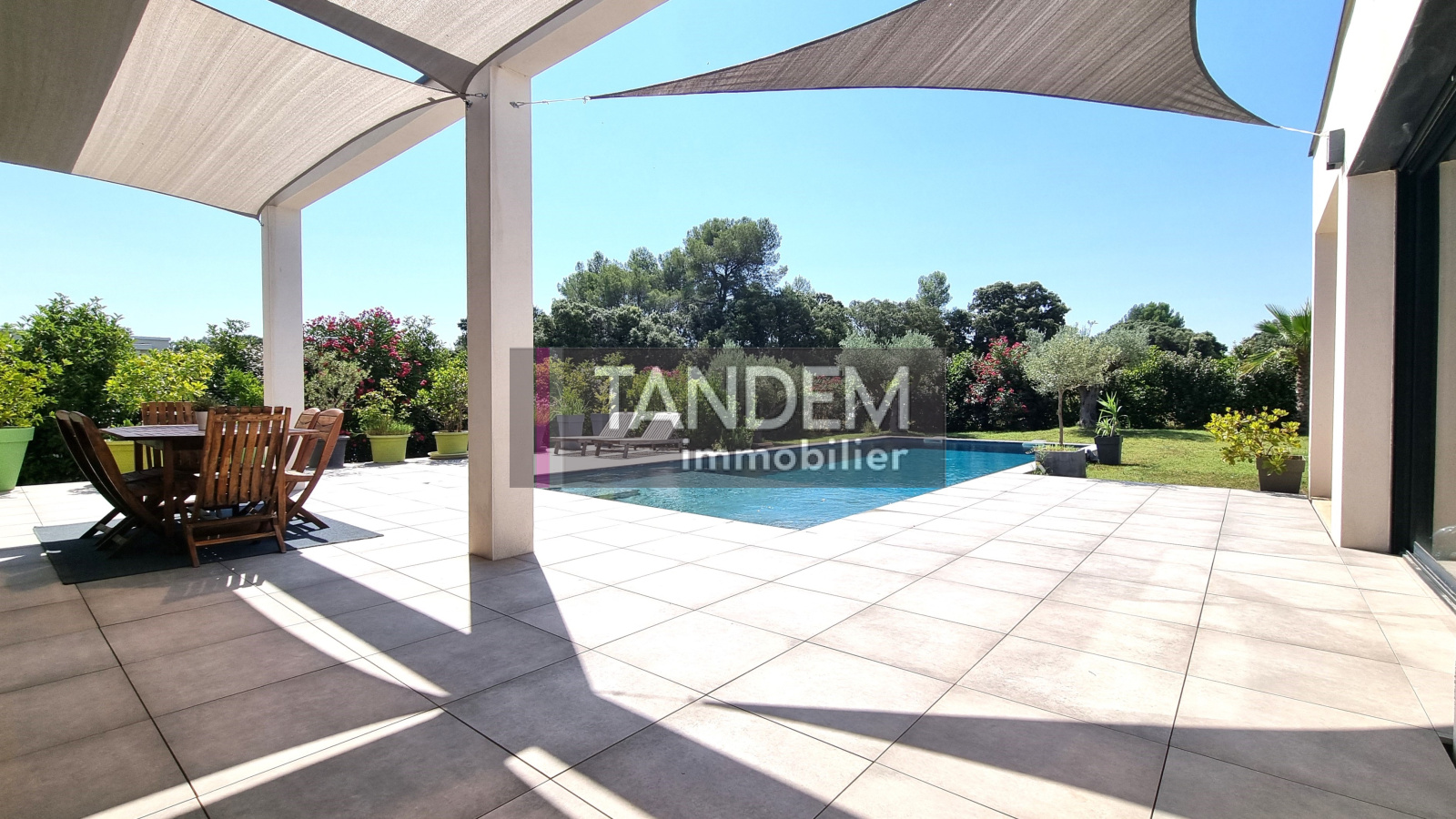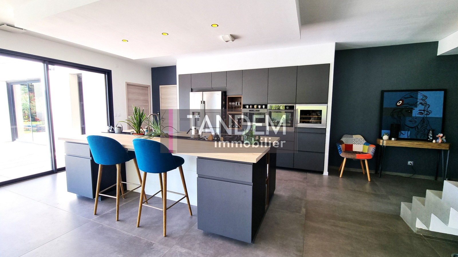 VENDUE PAR TANDEM IMMOBILIER Co-exclusivité. Assas, superbe villa contemporaine récente (2021) offrant 217 m² habitables . En rez-de-chaussée, l'entrée s'ouvre sur un espace de vie de 86 m² avec son espace cuisine entièrement équipé, généreusement ouvert sur le jardin et la campagne environnante. Deux suites, chacune avec dressing et salle d'eau, et un office avec buanderie, complètent ce niveau. A l'étage, 3 autres chambres (dont une avec salle d'eau) et salle de bains. Chauffage/climatisation gainés, eau chaude solaire, dressing et placards équipés, menuiseries coulissantes aluminium avec volets roulants motorisés et centralisés, double garage... Des prestations choisies avec soin pour assurer confort de vie optimal, et sécurité. Côté extérieur, les terrasses et la piscine se prolongent d'un bel espace pelousé et paysagé. Une villa aux volumes généreux qui fera le bonheur d'une famille en quête d'un cadre de vie paisible.