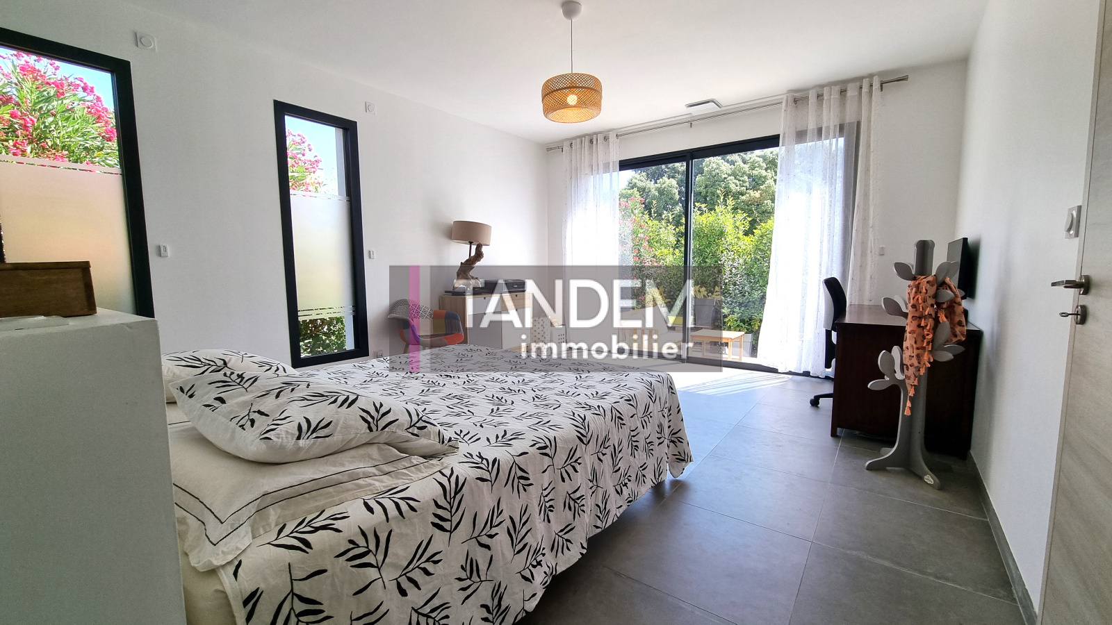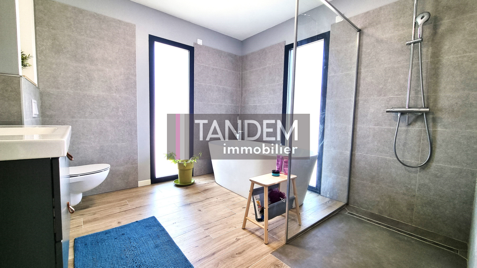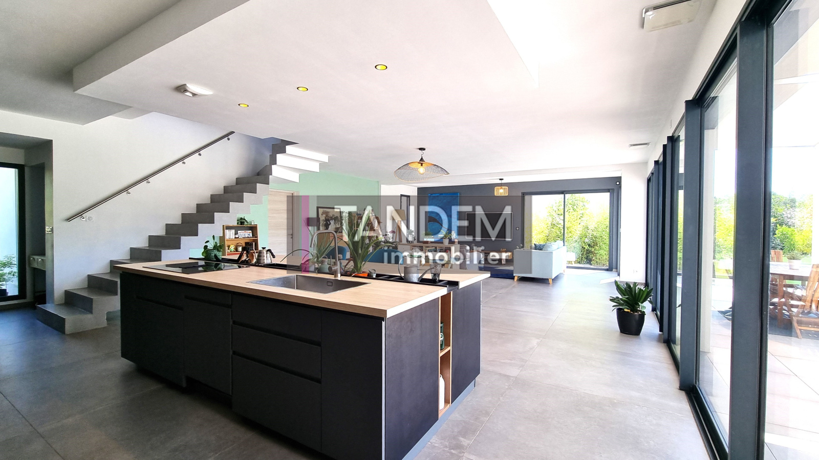 VENDUE PAR TANDEM IMMOBILIER Co-exclusivité. Assas, superbe villa contemporaine récente (2021) offrant 217 m² habitables . En rez-de-chaussée, l'entrée s'ouvre sur un espace de vie de 86 m² avec son espace cuisine entièrement équipé, généreusement ouvert sur le jardin et la campagne environnante. Deux suites, chacune avec dressing et salle d'eau, et un office avec buanderie, complètent ce niveau. A l'étage, 3 autres chambres (dont une avec salle d'eau) et salle de bains. Chauffage/climatisation gainés, eau chaude solaire, dressing et placards équipés, menuiseries coulissantes aluminium avec volets roulants motorisés et centralisés, double garage... Des prestations choisies avec soin pour assurer confort de vie optimal, et sécurité. Côté extérieur, les terrasses et la piscine se prolongent d'un bel espace pelousé et paysagé. Une villa aux volumes généreux qui fera le bonheur d'une famille en quête d'un cadre de vie paisible.