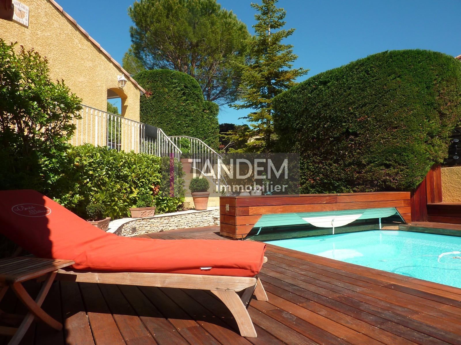 VENDU PAR TANDEM IMMOBILIER. Vailhauquès, très belle villa aux prestations contemporaines soignées offrant 270 m² habitables. Au rez-de-chaussée, superbe pièce de vie, 66 m², avec espace repas, salon avec cheminée. Salon TV. Belle cuisine équipée, 4 chambres en plain-pied, grande suite parents en étage. Vaste sous-sol aménagé, idéal pour un bureau ou une salle de jeu. Etat irréprochable. Parcelle paysagée 1.033 m² offrant piscine chauffée, au sel, cuisine d'été, et terrasse bois.