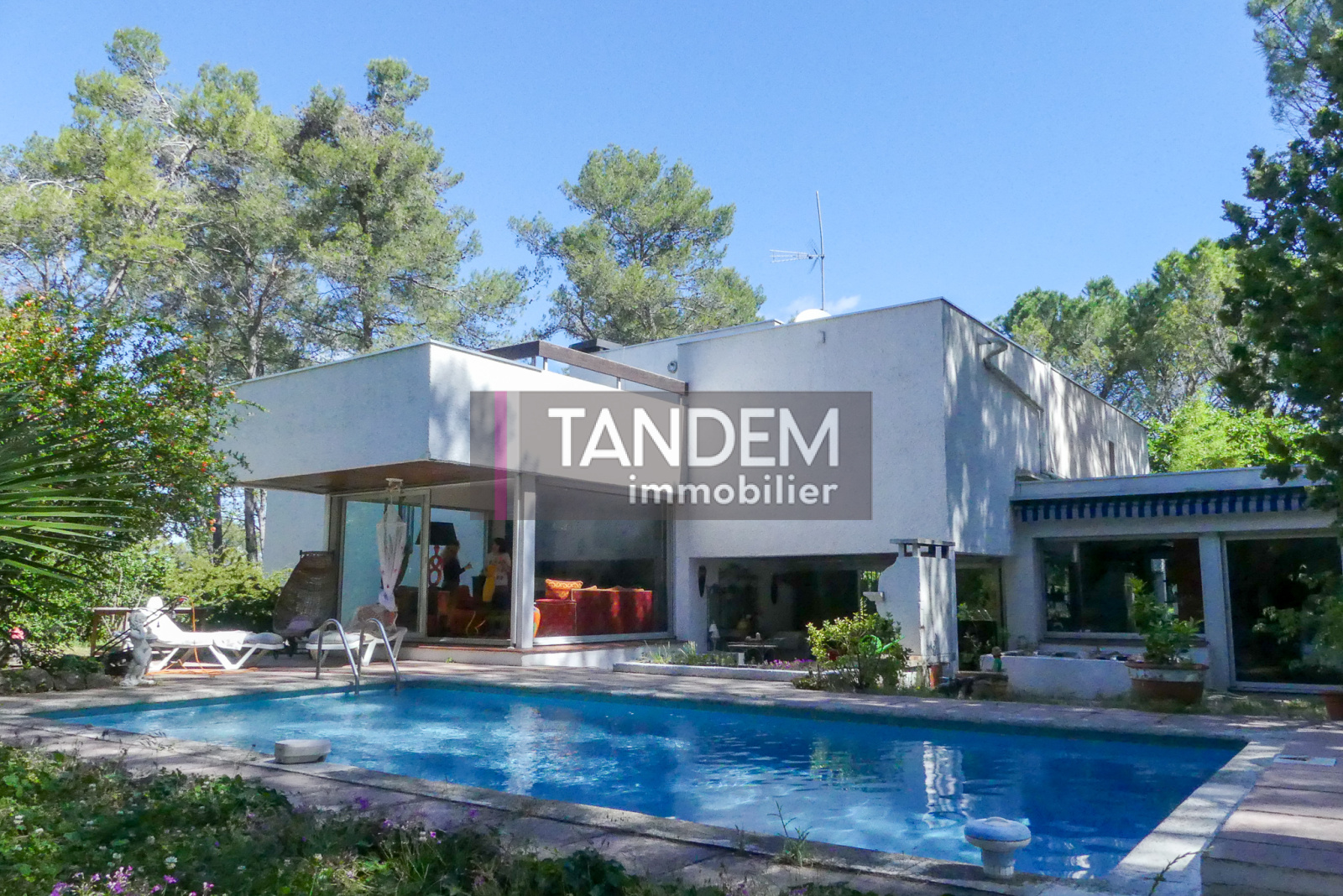 SOUS COMPROMIS DE VENTE TANDEM. Superbe villa avant-gardiste aux lignes intemporelles. Très belle pièce de vie aux multiples espaces baignés de lumières par de larges baies vitrées. 270m² habitables + un logement de 90m² totalement indépendant.
