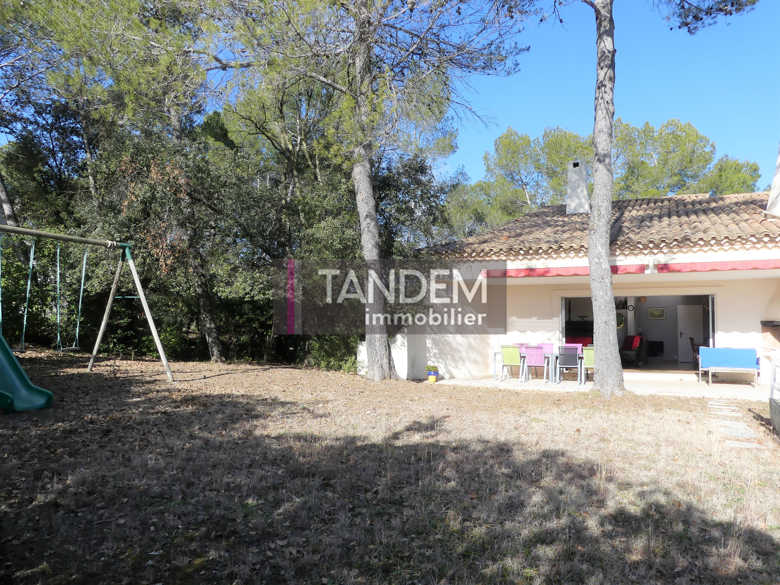 VENDUE. EXCLUSIVITE TANDEM IMMOBILIER Proche du centre village, en position dominante, jolie villa d'architecte au charme intemporel. Belle pièce de vie lumineuse ouverte, par une très large baie vitrée, sur une grande terrasse prolongée par le jardin et l'espace piscine. 2 chambres et bureau en plain-pied. A l'étage, 2 autres chambres, mezzanine et bureau. Vaste sous-sol avec salle de jeux, cave et atelier. Emplacement de 1er ordre, avec une superbe parcelle boisée de plus de 1.800 m² . Intimité et calme absolus.